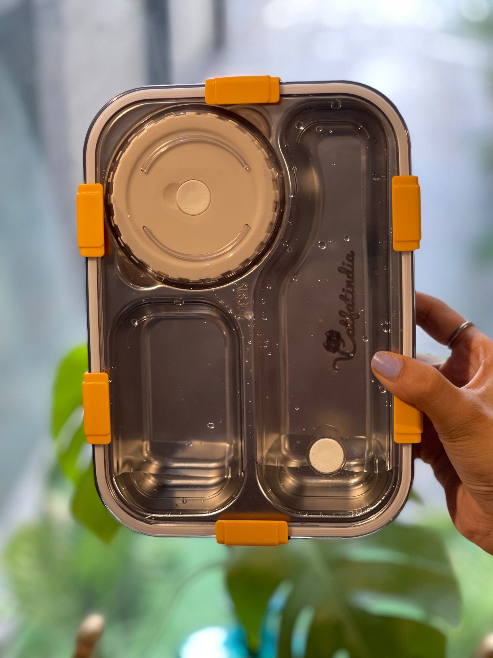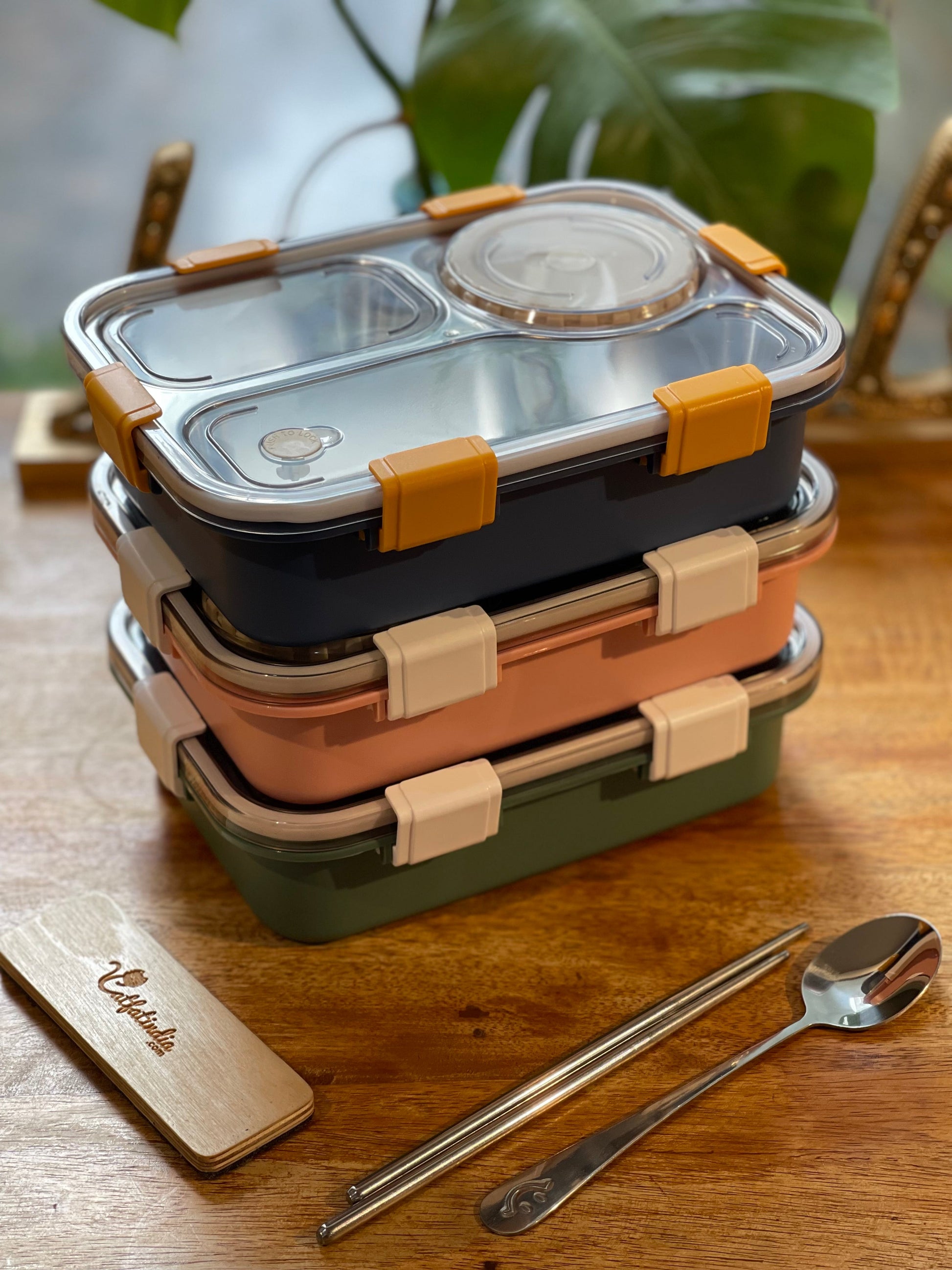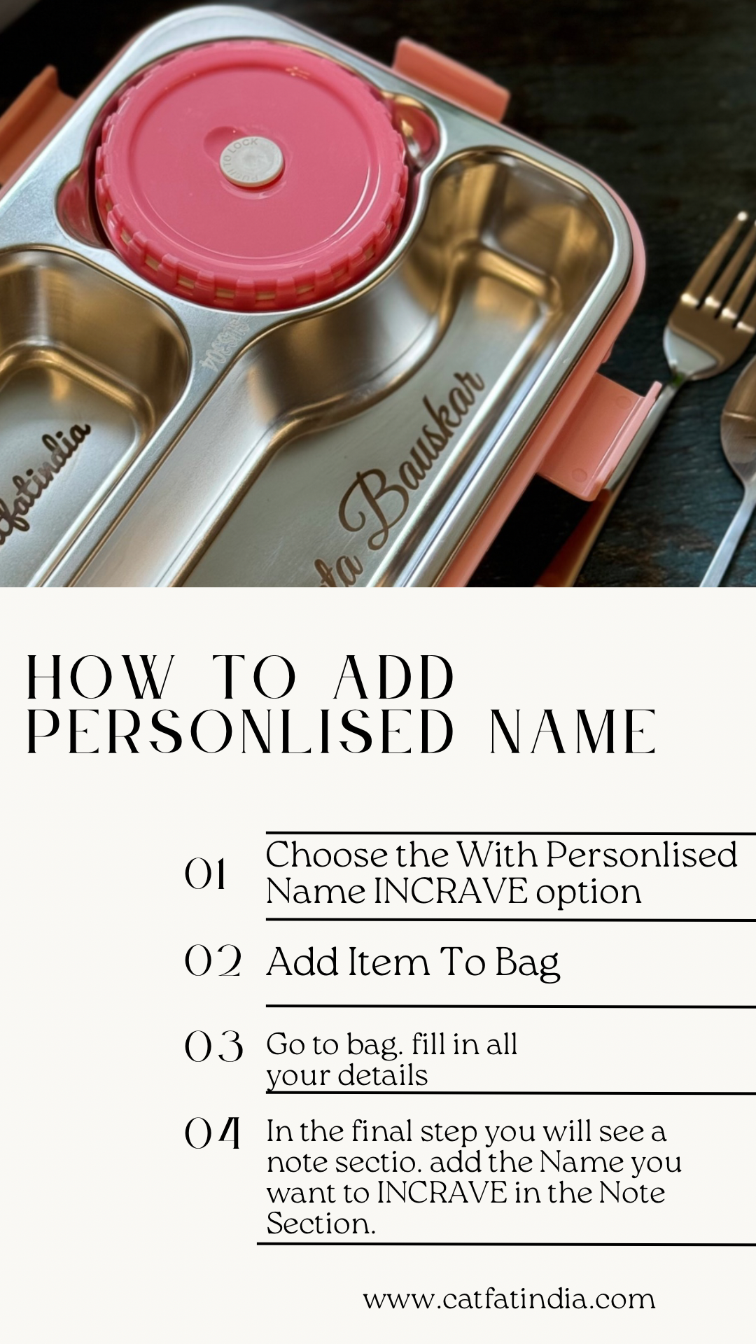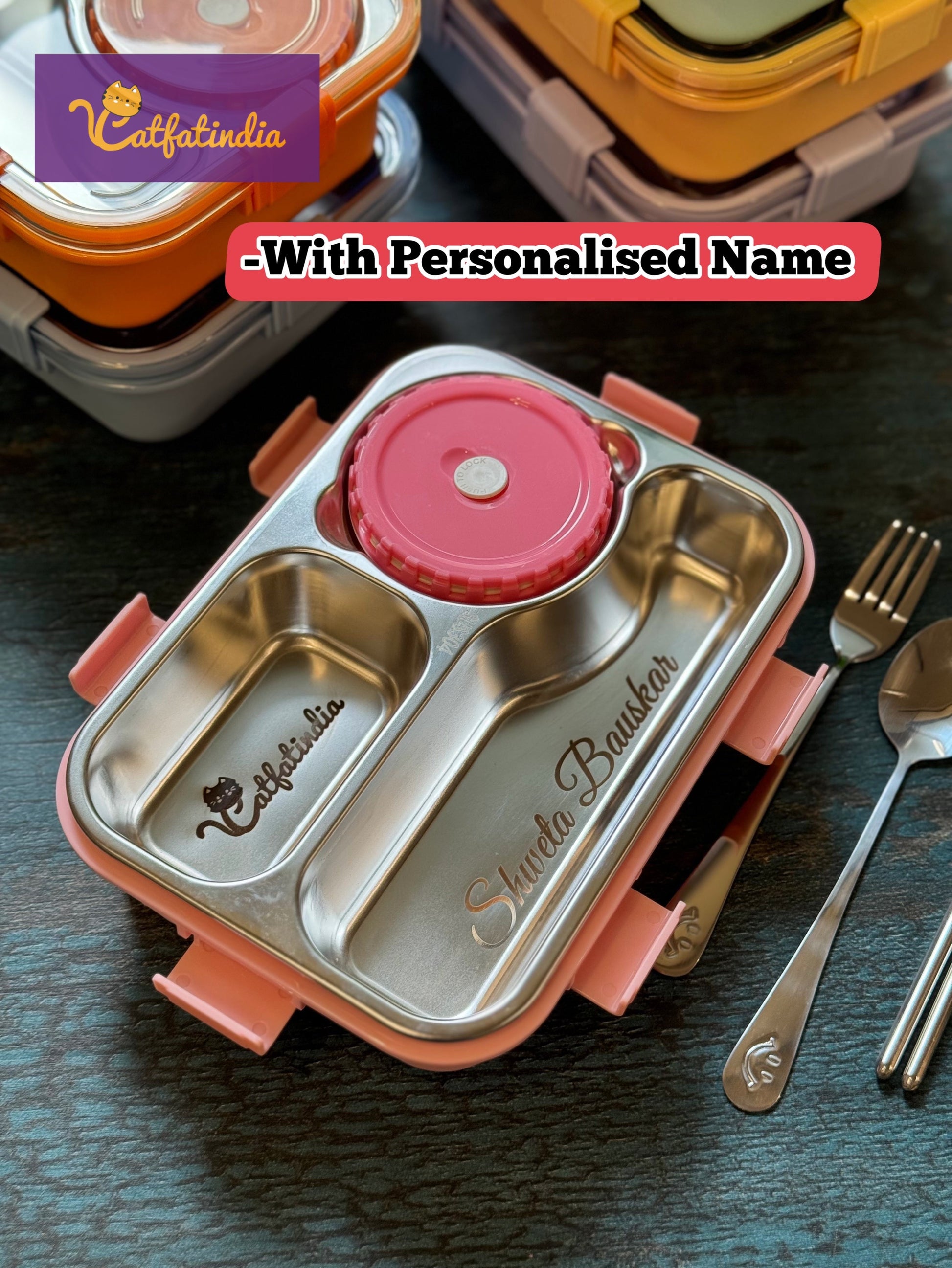 Catfatindia Balanced Meal Stainless Steel Bento Lunch box. Comes with free Spoon, Chopsticks . 304 Grade Stainless Steel. 6 way Lock system. To add customize name, choose the with name INCRAVE options and mention the name you wish to INCRAVE in the note section while checkout. If any personal color you want, make sure to mention in the note. if its available we will send it otherwise we will send in available options NOTE : gravy items might mix inside if not kept properly.